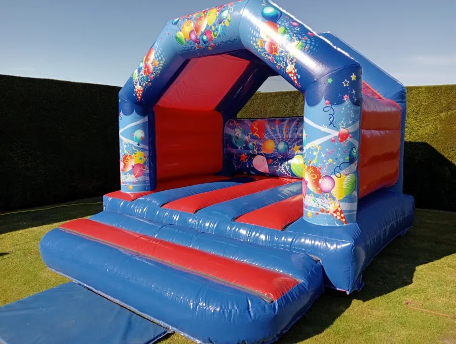 Coloured blue and red with multi coloured ballons